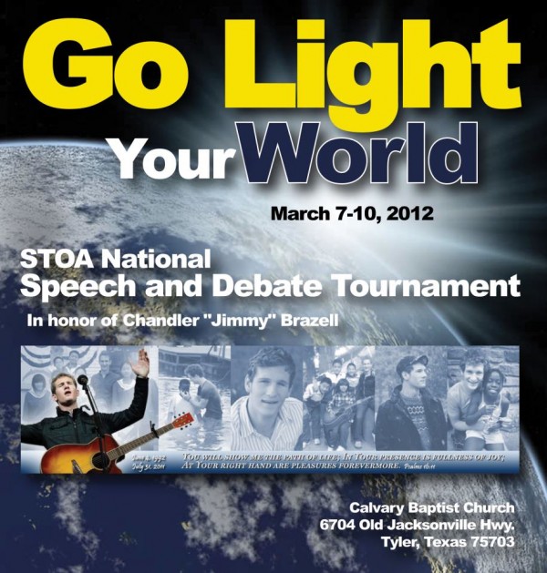March 7-10th, 2012 was the first annual ‘Go Light Your World’ National Speech and Debate Tournament in Tyler, Texas. Chandler “Jimmy” Brazell was remembered and honored by the theme ‘Go Light Your World’, the Tournament put on in his honor, and by all the volunteers who served in honor of Jimmy.