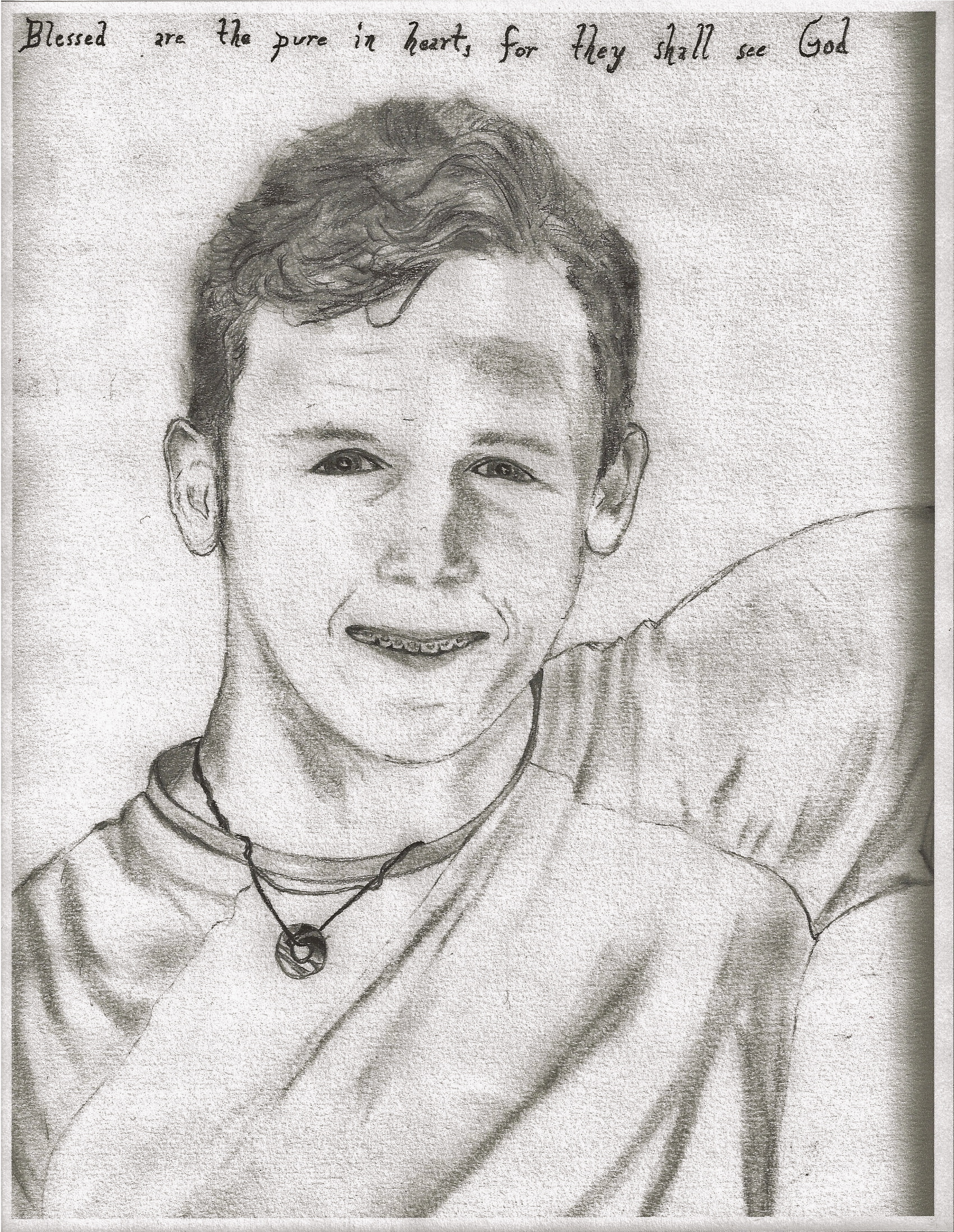 This drawing is taken from a photo of Jimmy that you have possibly seen before. The photo was taken right before he left on his first trip to China while sitting with Rhonda and I on our back porch. The necklace that he is wearing in Skyler’s drawing is a special pendant given to him from a student he taught in China. At the top of the drawing is the verse “Blessed are the pure in Heart, for they shall see God.” This verse found in Matthew 5:8 was one of Jimmy’s life verses and, of course, you can find it written on his desk in his room.